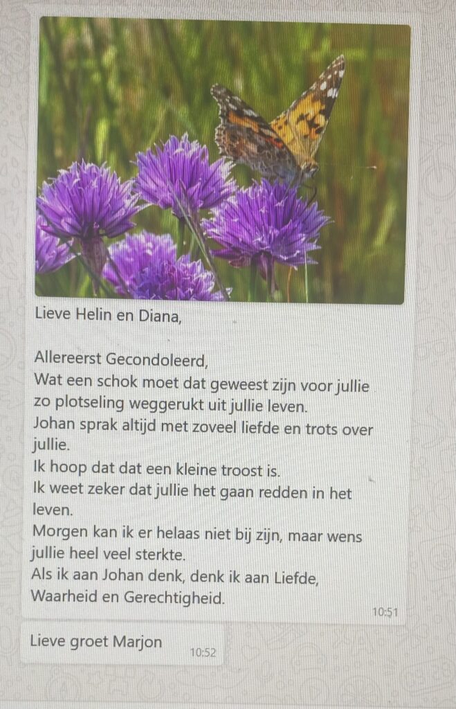 betekenen, nu of later, laat het mij weten. Zoals Johan en jijzelf in het leven hebben gestaan en naar mensen hebben omgekeken, is inspirerend. Ik heb er alle vertrouwen in dat jij dat zult voortzetten en als ik daar een bijdrage aan kan leveren, doe ik dat heel graag. Gecondoleerd met jouw verlies en veel sterkte de komende komende periode. Groet, Richard